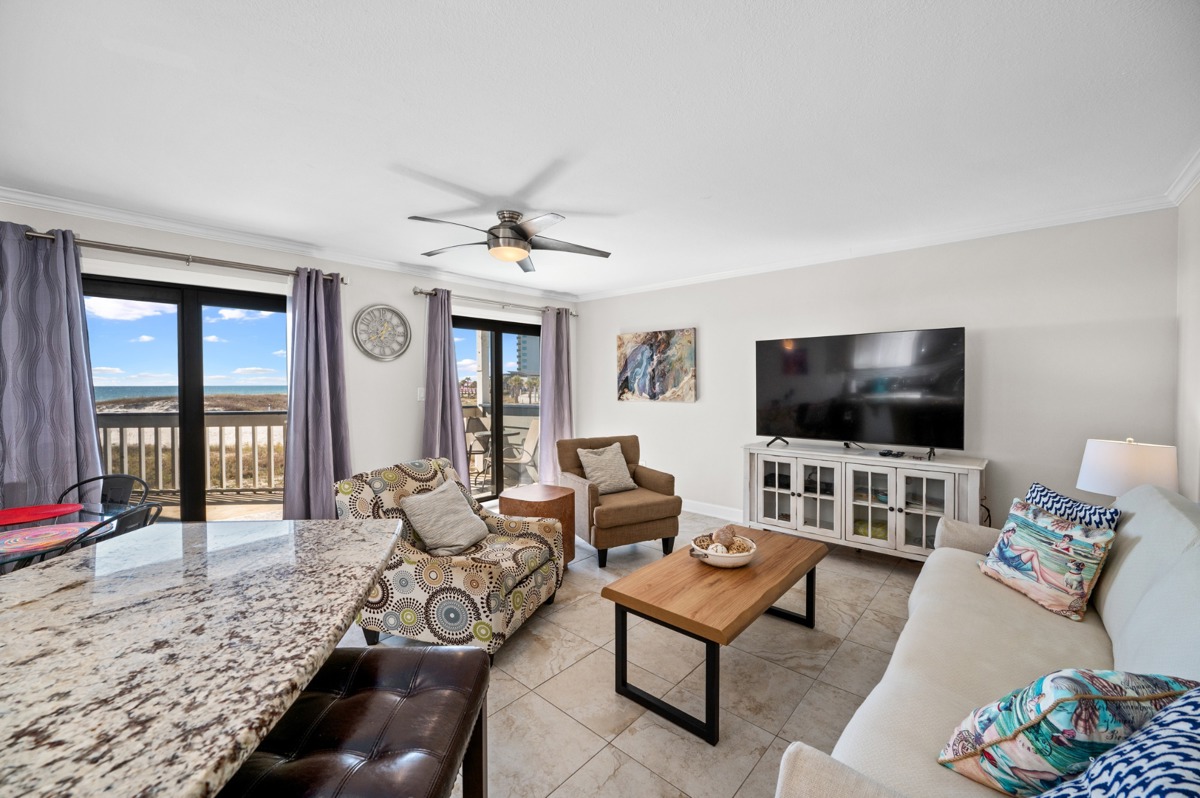 We enjoyed our stay so much! The condo was clean and as pictured online. The pool was a very close view from the door of the room. The walk down to the beach was easy and great for families with lots of stuff to carry! VERY close to all the restaurants of gulf shores and could walk to souvenir shops. Will definitely consider staying again in the future!